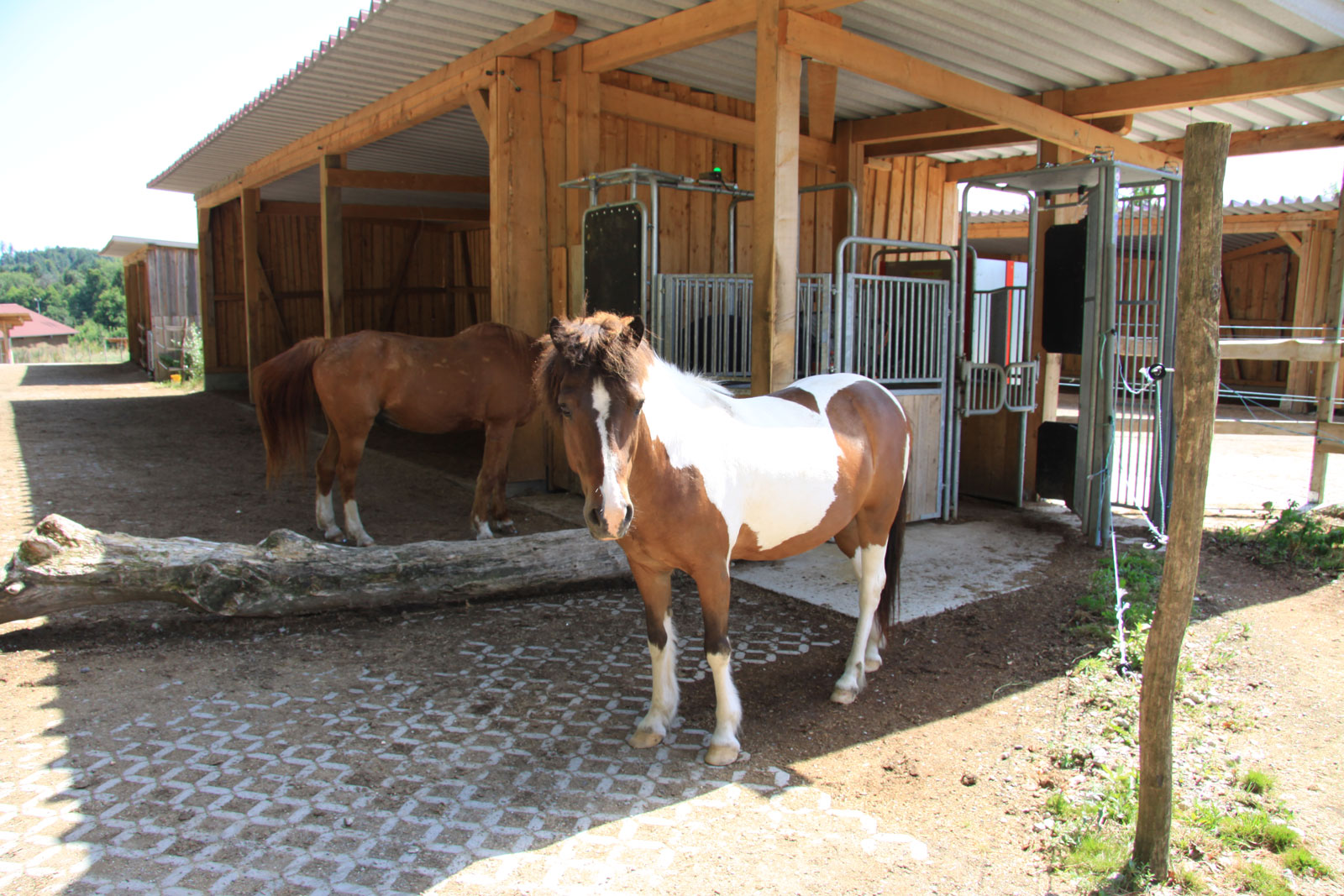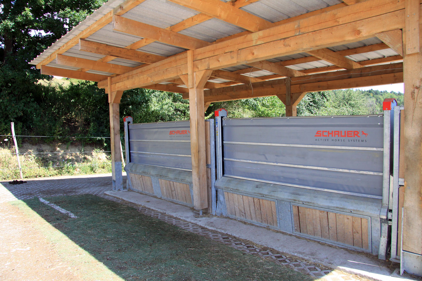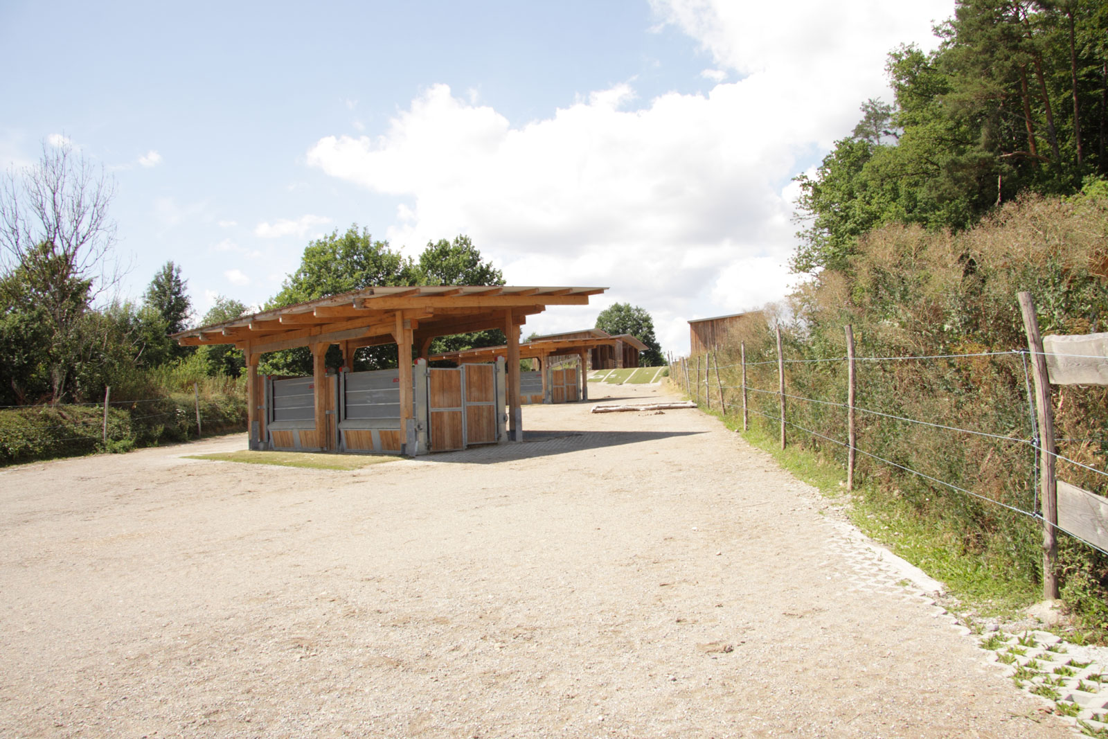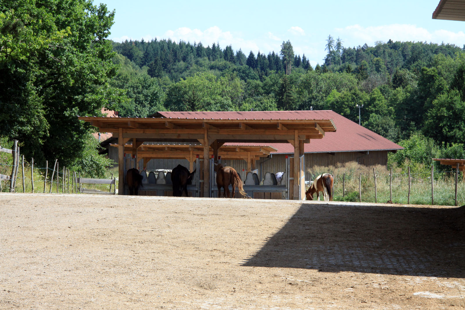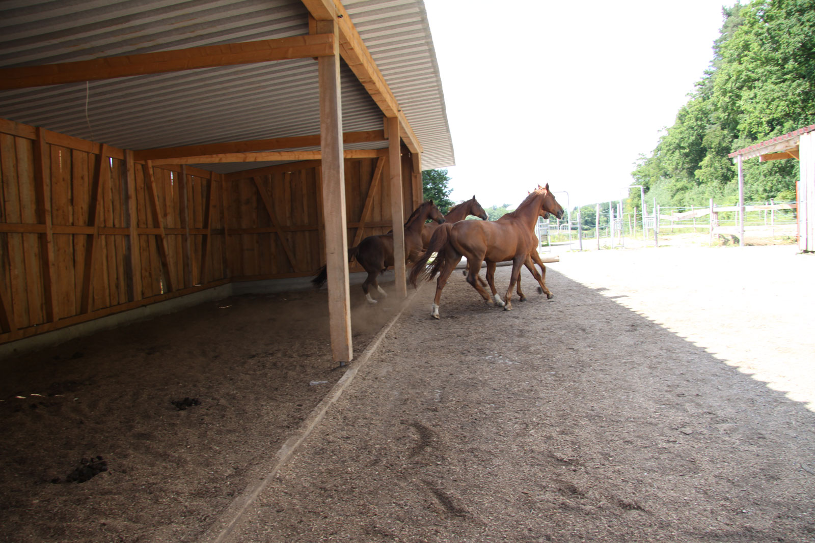 Eine offene Tränke, aus der von zwei Richtungen die Pferde in vollen Zügen trinken können, rundet das Bedürfnispacket vollumfänglich ab. Die Liegehallen mit Waldboden laden zum liegen und entspannen ein. Bei Wind und Wetter können die Pferde im trockenen an den HeuTimern stehen, im trockenen ihr Kraftfutter zu sich nehmen, oder sich auf mehr als 2.000 m² befestigte Bewegungsfläche frei bewegen.