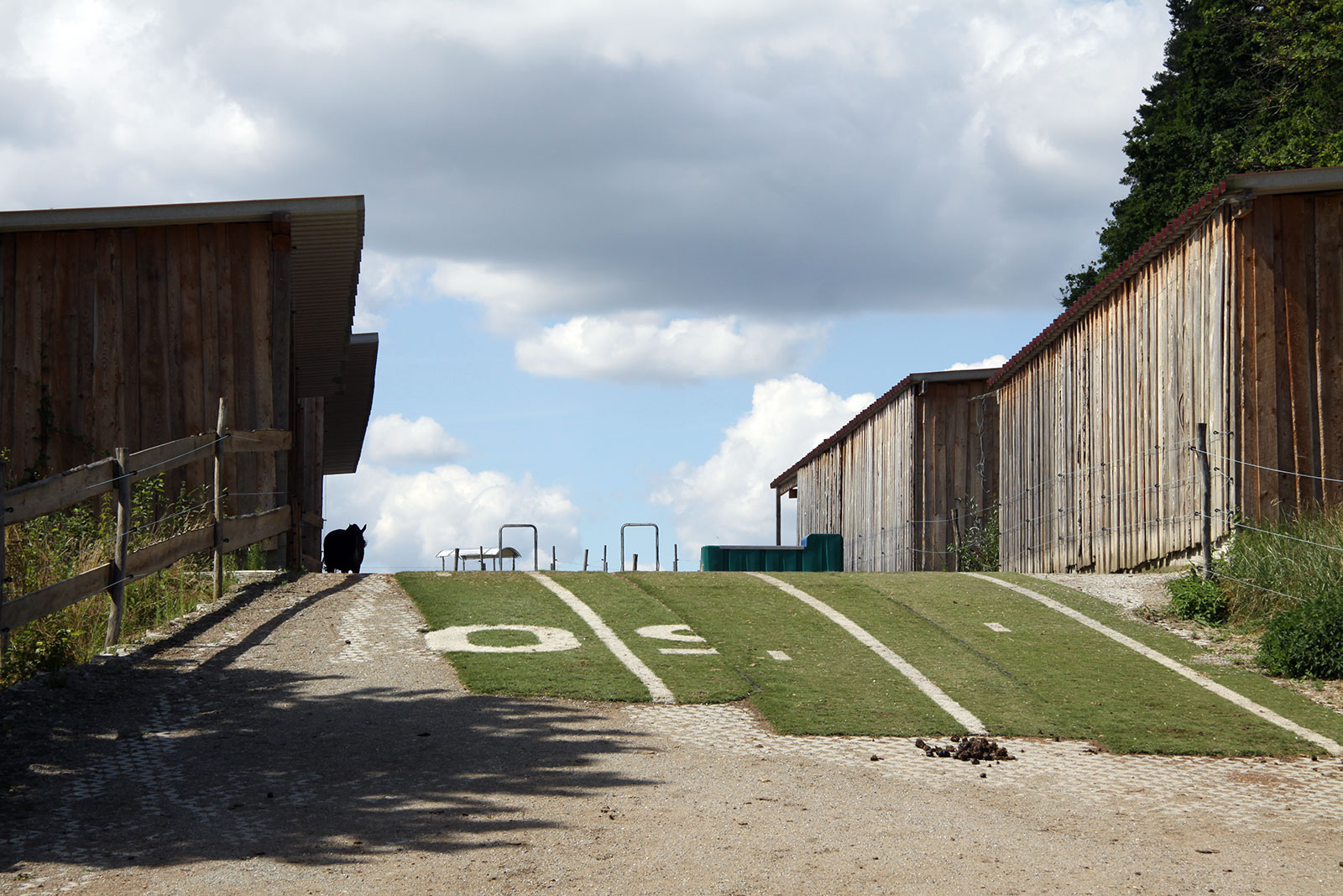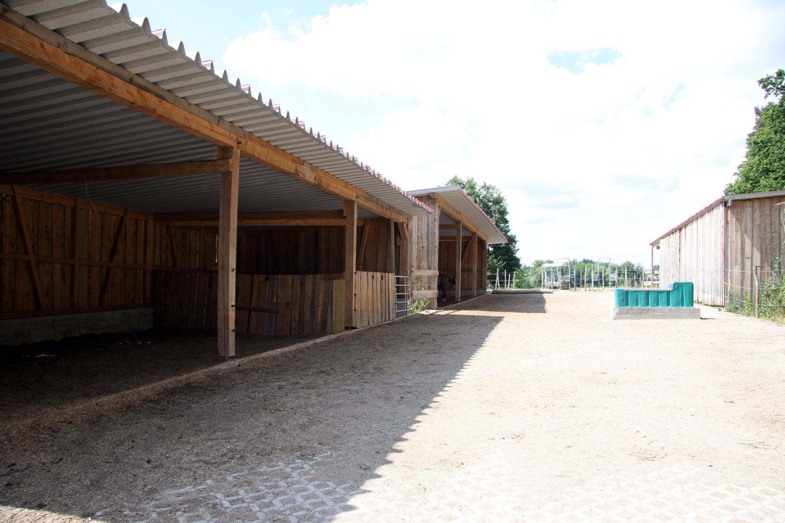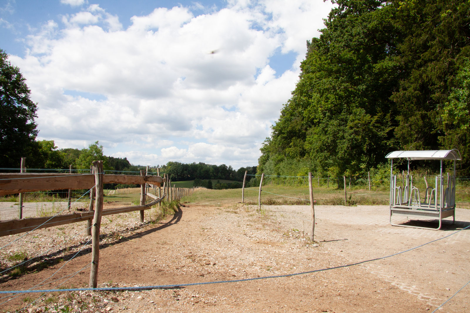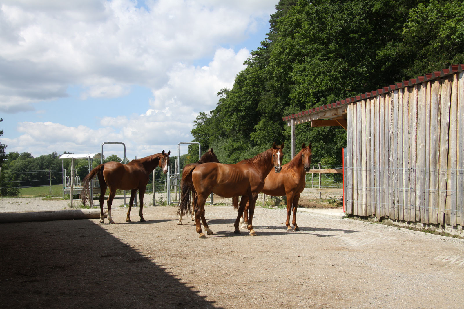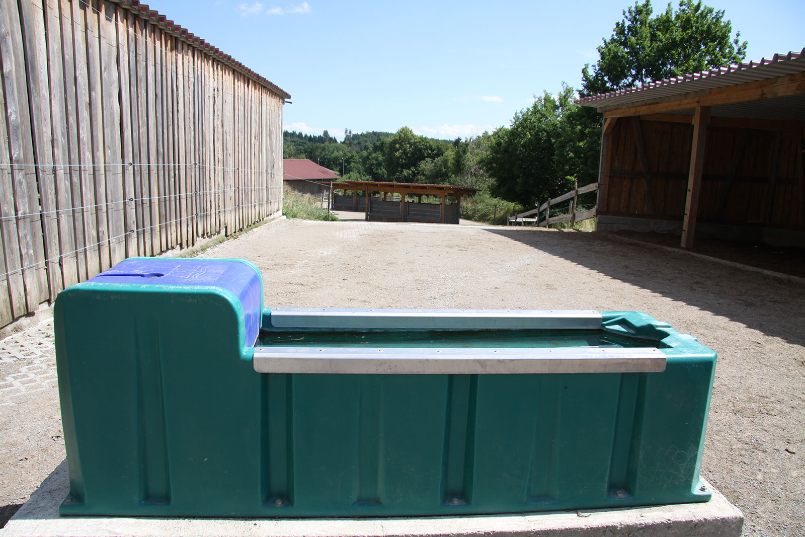 Eine offene Tränke, aus der von zwei Richtungen die Pferde in vollen Zügen trinken können, rundet das Bedürfnispacket vollumfänglich ab. Die Liegehallen mit Waldboden laden zum liegen und entspannen ein. Bei Wind und Wetter können die Pferde im trockenen an den HeuTimern stehen, im trockenen ihr Kraftfutter zu sich nehmen, oder sich auf mehr als 2.000 m² befestigte Bewegungsfläche frei bewegen.