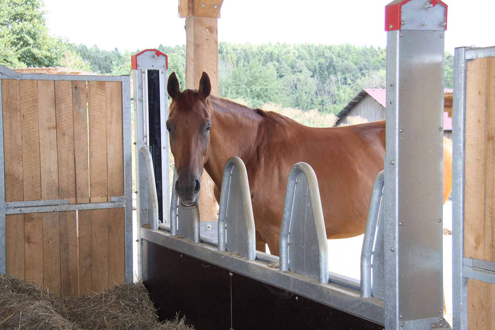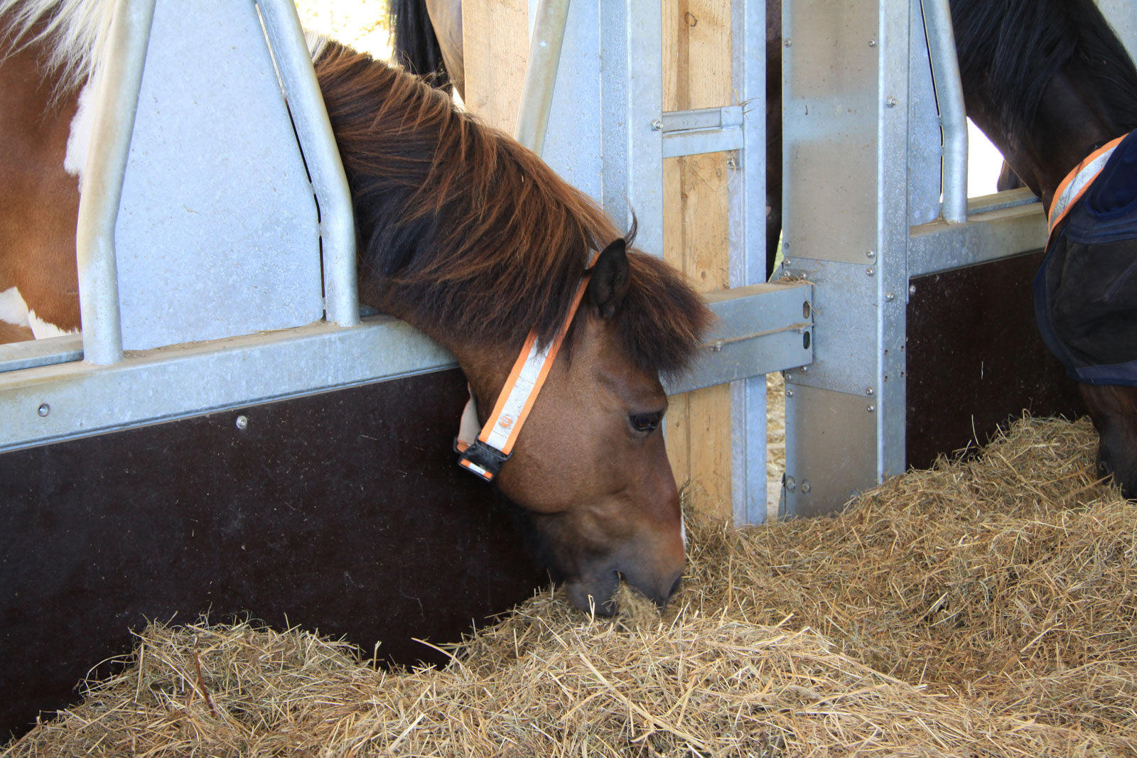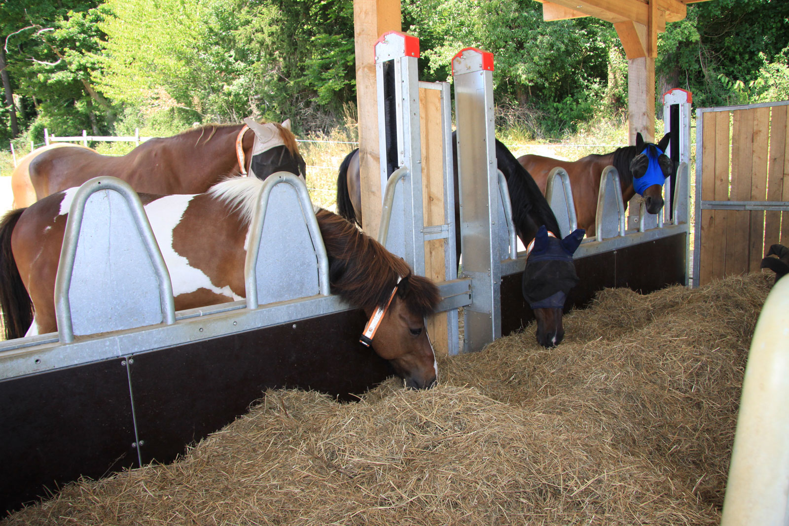 HeuTimer – Das Raufutter Heu wird über sogenannte HeuTimer zur Verfügung gestellt. Die automatisierte Heuraufe hat fest hinterlegte Fresszeiten, in der die Pferde problemlos mit ausreichend vielen Fressplätzen an das Heu kommen. in regelmäßigen Abständen schließt sich der Heubereich aber, um ein überfressen zu verhindern. So sind die Pferde optimal eingestellt (häufig kleine Mengen an Heu).